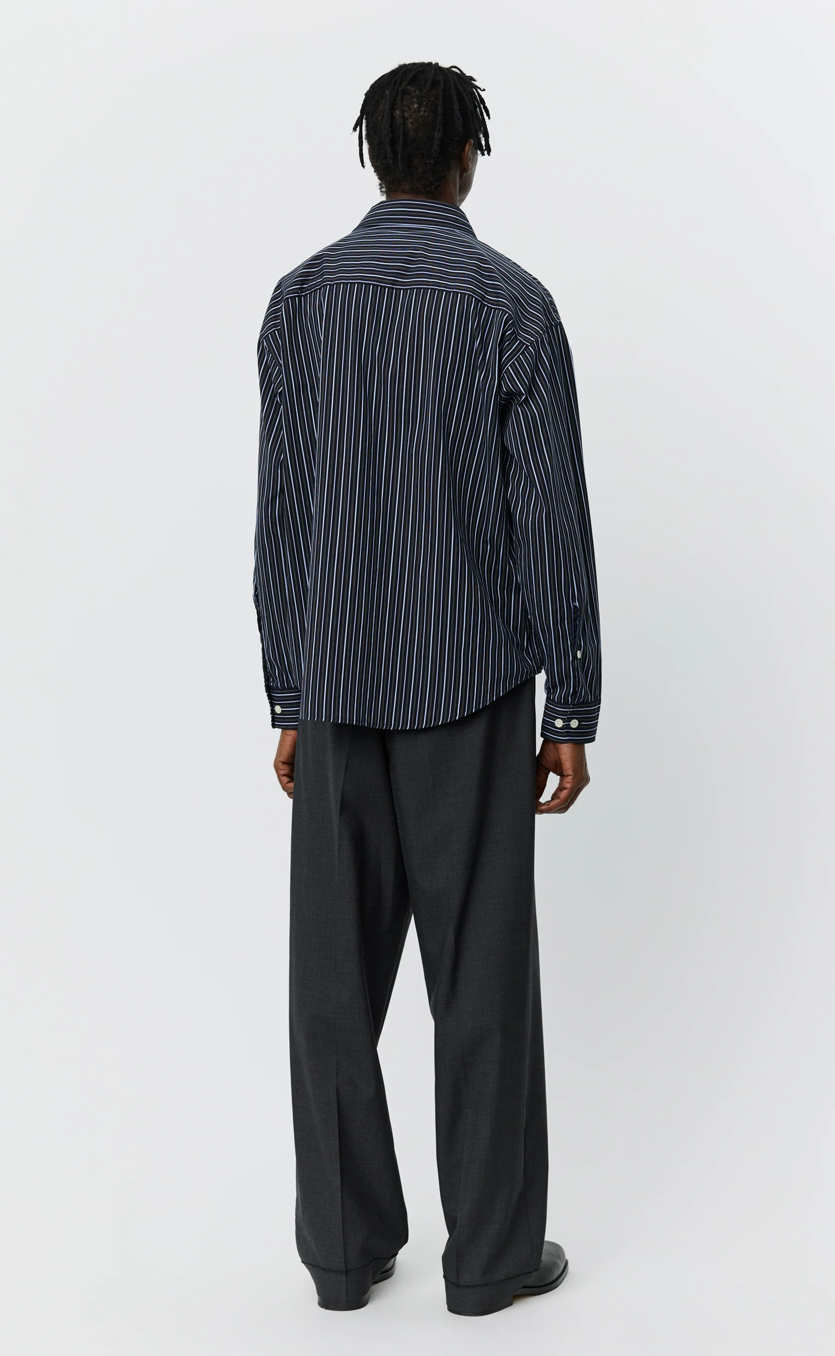 The Exact Shirt has a boxy and slightly cropped fit with drop shoulders and a curved hem. Featuring a spread collar and clean front made without chest pocket and placket. Cut from a structured cotton with a blue raised multi stripe on a black ground.